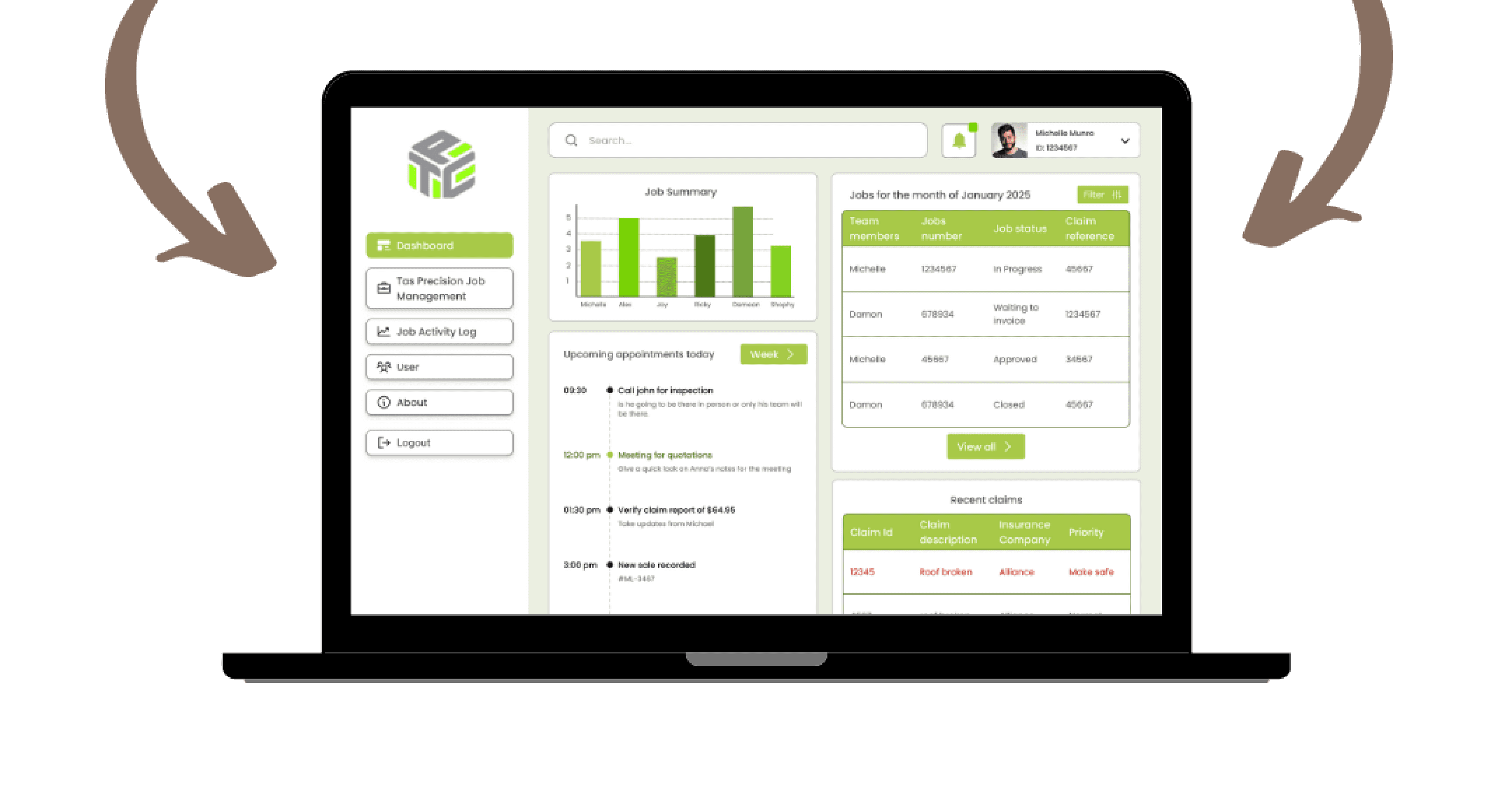 Simplified complex claim tracking and job management through structured layouts and clear categorization.